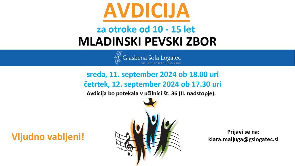 Avdicija bo potekala v sredo, 11. septembra 2024 ob 18.00 uri in v četrtek, 12.9.2024 ob 17.30 uri. Na avdicijo se morate prijaviti na: klara.maljuga@gslogatec.si.