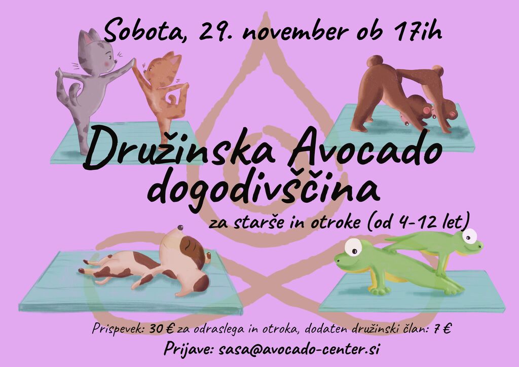 Družinska Avocado pustolovščina je namenjena staršem in otrokom, ki si želijo preživeti čas drugače – z veliko gibanja, dotika, zaupanja in smeha. Primerna je za vse družine, ki bi rade okrepile svoj stik, se sprostile in skupaj doživele nekaj novega. Ni pomembno, kako gibčni ste – pomembno je le, da pridete z odprtim srcem in željo po sproščenem spoznavanju svojih otrok.