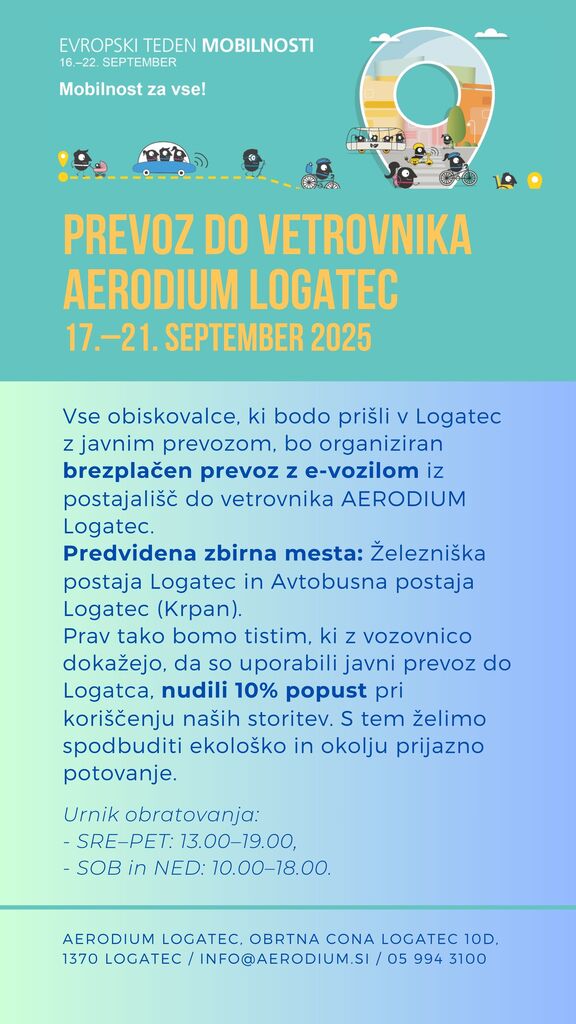 Vse obiskovalce, ki bodo prišli v Logatec z javnim prevozom, bo organiziran brezplačen prevoz z e-vozilom iz postajališč v vetrovnik AERODIUM Logatec. Predvidena zbirna mesta: Železniška postaja Logatec in Avtobusna postaja Logatec (Krpan). Prav tako bomo tistim, ki z vozovnico dokažejo, da so uporabili javni prevoz do Logatca, nudili 10% popust pri koriščenju naših storitev. S tem želimo spodbuditi ekološko in okolju prijazno potovanje.