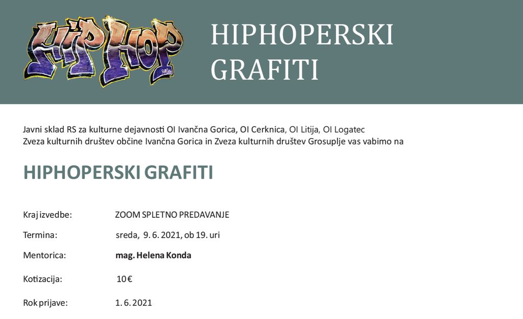 Predavateljica, ki že več kot 20 let raziskuje grafite in urbano umetnost bo predstavila njihovo pojavnost kot svojevrsten kazalec družbenih razmer. Hiphoperski grafiti so v množični kulturi kot najbolj prepoznaven in prevladujoč grafitarski slog sprožili številne spremembe v umetnosti, aktivizmu, oblikovanju in množični kulturi na splošno. Njihova pojavnost že na stenah starorimskih katakomb se je s časom razvila, nadgradila in se skozi stoletja prelevila v vrsto različnih oblik, tudi v velike tehnično zahtevne podobe, poznane po vsem svetu zaradi prenosa preko spletnega medmrežja.