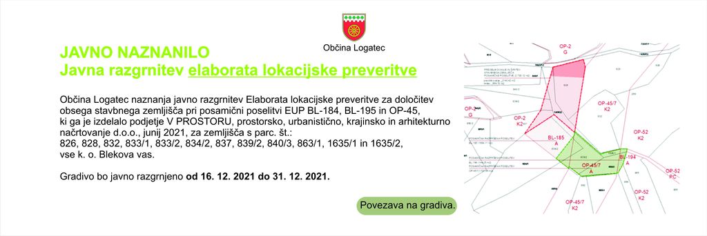 Od 16. 12. 2021 do 31. 12. 2021 bosta javno razgrnjejna Pobuda za izvedbo postopka lokacijske preveritve – določanje obsega stavbnega zemljišča pri posamični poselitvi in Elaborat lokacijske preveritve za določitev obsega stavbnega zemljišča pri posamični poselitvi EUP BL-184, BL-195 in OP-45/7, ki ga je izdelal V PROSTORU, prostorsko, urbanistično, krajinsko in arhitekturno načrtovanje d.o.o., PE Ilirska Bistrica, Vojkov drevored 2, 6250 Ilirska Bistrica odgovorni prostorski načrtovalec Darja Blatnik, št. 21/PA-006-i, junij 2021, za parc. št. 826, 828, 832, 833/1, 833/2, 834/2, 837, 839/2, 840/3, 863/1, 1635/1 in 1635/2, vse k. o. Blekova vas.