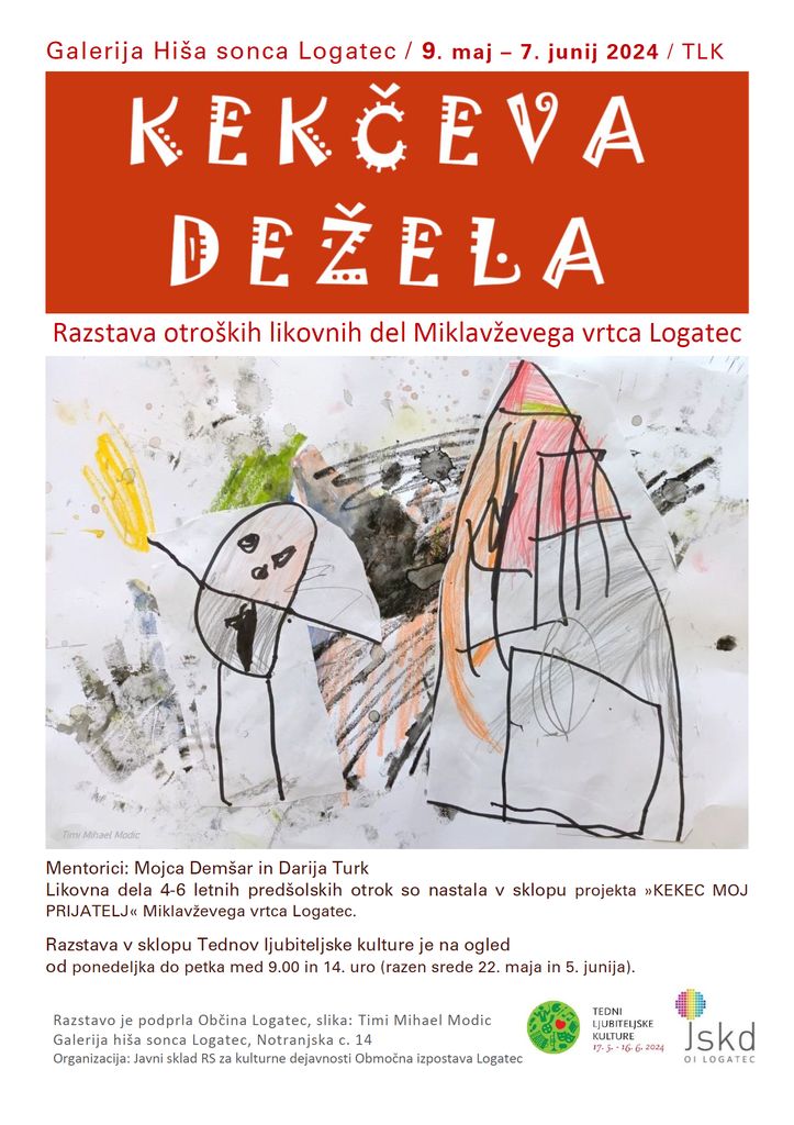 Logaška območna izpostava Javnega sklada RS za kulturne dejavnosti organizira razstavo KEKČEVA DEŽELA, otroških likovnih del Miklavževega vrtca Logatec. Razstava v sklopu tednov ljubiteljske kulture je v Galeriji hiša sonca Logatec na ogled od 9. maja do 7. junija 2024, od ponedeljka do petka med 9.00 in 14. uro (razen srede 22. maja in 5. junija).