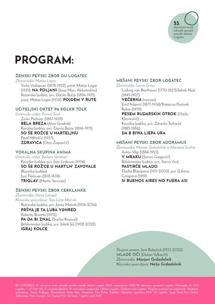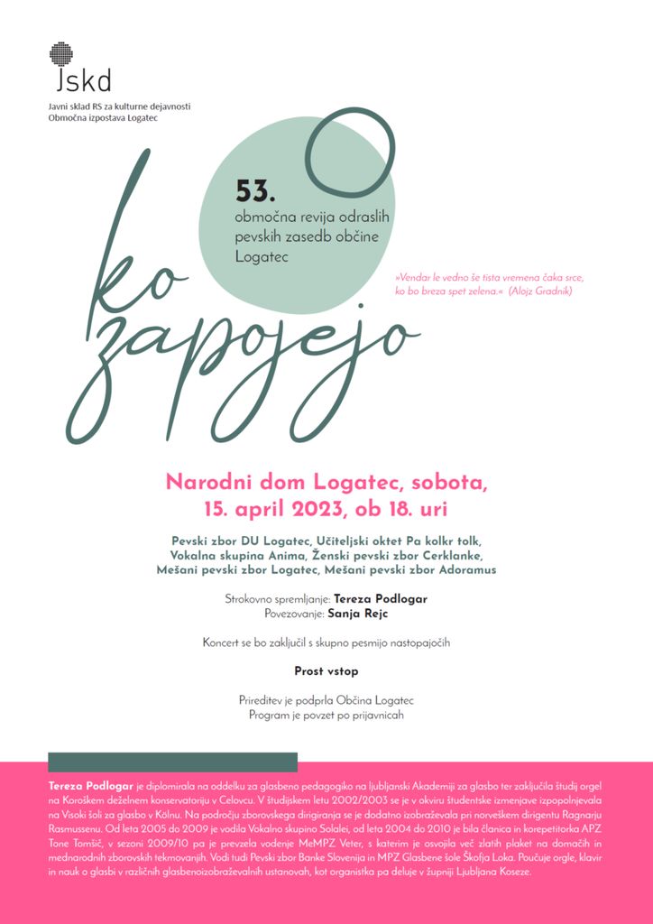 V soboto, 15. aprila, ob 18. uri, se bodo na odru logaškega Narodnega doma predstavili odrasli zbori in male vokalne skupine z območja občine Logatec ter gostje iz Cerkna. V programu, ki ga bo povezovala Sanja Rejc bo nastopilo preko 110 pevcev. Umetnim skladbam slovenskih in tujih skladateljev ter priredbam ljudskih pesmi, ki jih bodo izvajale posamezne zasedbe bo na koncu sledila še skupna zelo znana skladba Mlade oči Jureta Robežnika, ki je lani zaključil svojo življenjsko pot.
