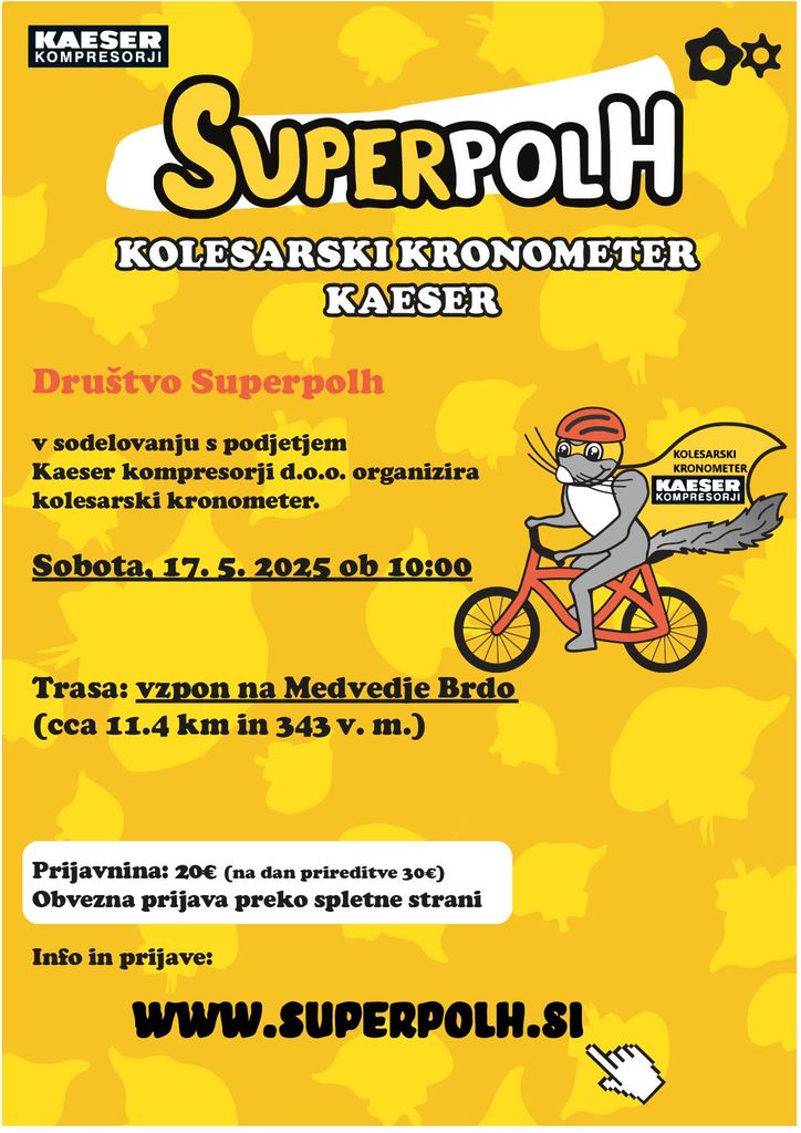 Tradicionalno tekmovanje v vožnji na čas se vrača! Pridruži se nam na Kolesarskem kronometru Kaeser Superpolh, kjer boš lahko preizkusil svojo hitrost, vzdržljivost in tekmovalni duh na čudoviti logaški trasi.