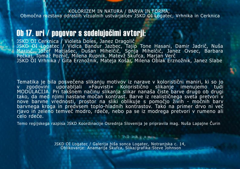 Razstavljena so dela 19-ih avtorjev z območja izpostav JSKD Logatec, Vrhnika in Cerknica.