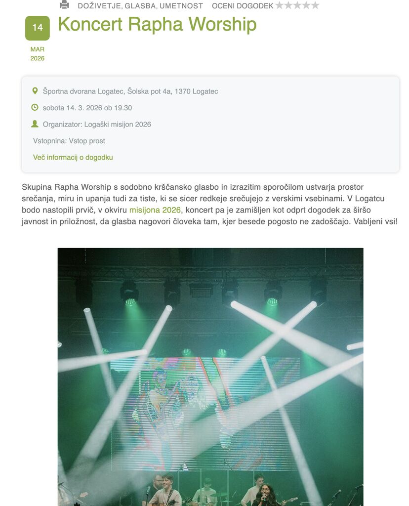 Skupina Rapha Worship s sodobno krščansko glasbo in izrazitim sporočilom ustvarja prostor srečanja, miru in upanja tudi za tiste, ki se sicer redkeje srečujejo z verskimi vsebinami. V Logatcu bodo nastopili prvič, v okviru misijona 2026, koncert pa je zamišljen kot odprt dogodek za širšo javnost in priložnost, da glasba nagovori človeka tam, kjer besede pogosto ne zadoščajo. Vabljeni vsi!