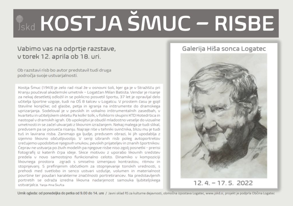 Razstava risb Kostje Šmuca je prva samostojna predstavitev ljubiteljskega ustvarjalca samouka, ki se je risanju intenzivneje posvetil ob upokojitvi. S prefinjenim občutkom za stopnjevanje tonskih vrednosti in svetlo-temnih kontrastov ustvarja dinamičen likovni prostor. Na risbah z ritmičnimi prehodi med svetlobo in senco ustvari vzdušje, volumen in materialnost površine ter poudari karakterne značilnosti portretirancev. Serija izbranih portretov v svinčniku in tušu odraža avtorjevo izjemno likovno občutljivost in nadarjenost.
