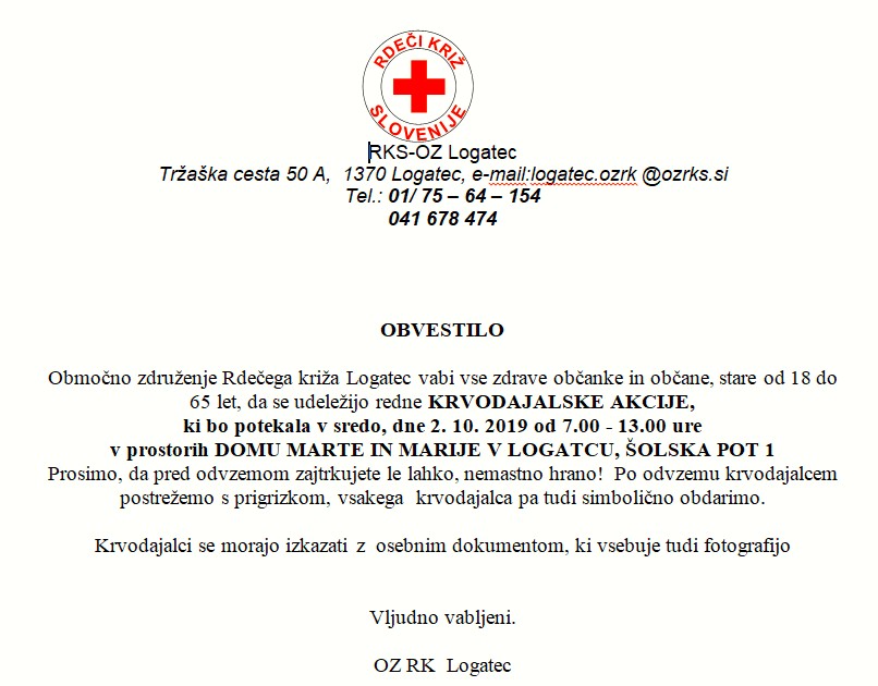 Organizator: RDEČI KRIŽ SLOVENIJE - OBMOČNO ZDRUŽENJE LOGATEC