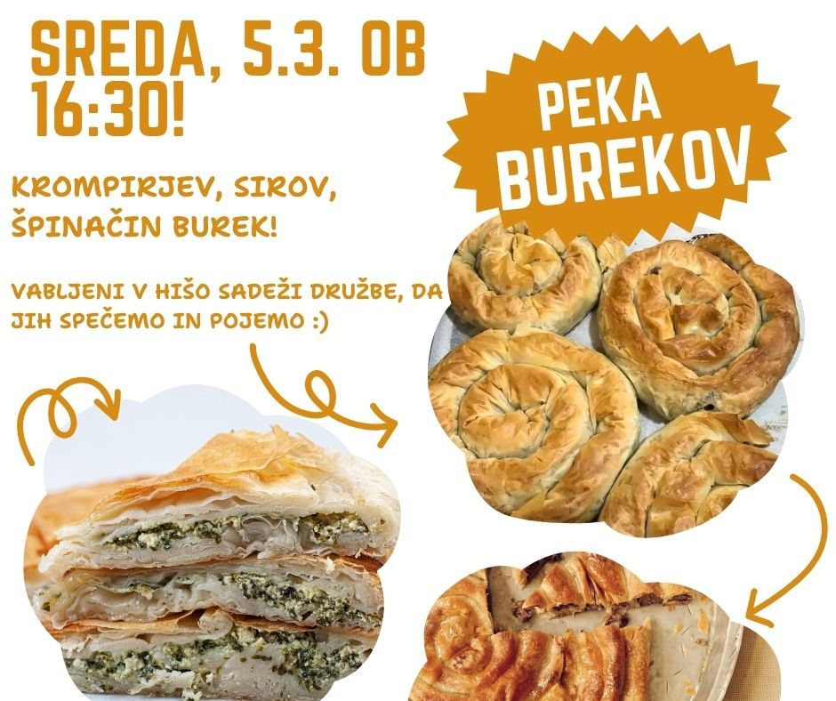 Ponovno je tu kuharska delavnica za VSE! V sredo, 5.3. med 16:30 in 18:00 v Hiši Sadeži družbe Logatec pečemo BUREKE - krompirjevega, sirovega in špinačnega. Dobrodošli, da skupaj zavihamo rokave in kaj finega pojemo.
