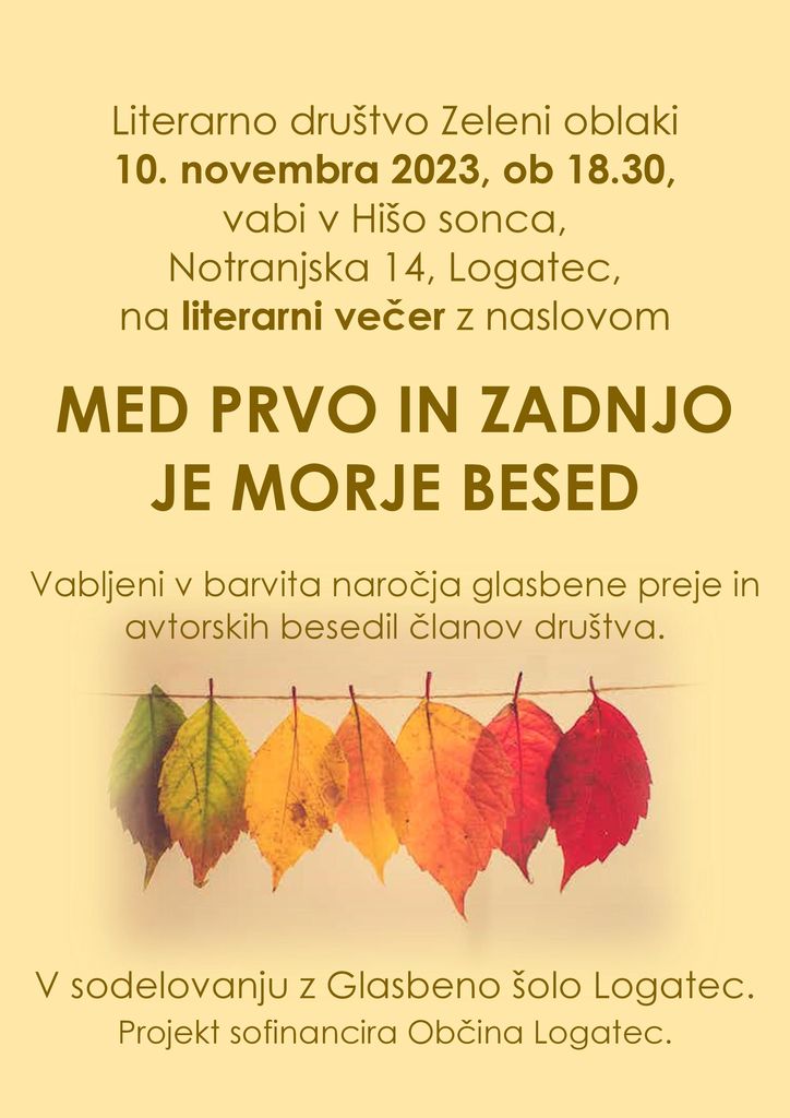 Literarni večer članov in članic Literarnega društva Zeleni oblaki. Najboljša spremljevalka literature je glasba, zato bodo z avtorji nastopili učenci Glasbene šole Logatec.