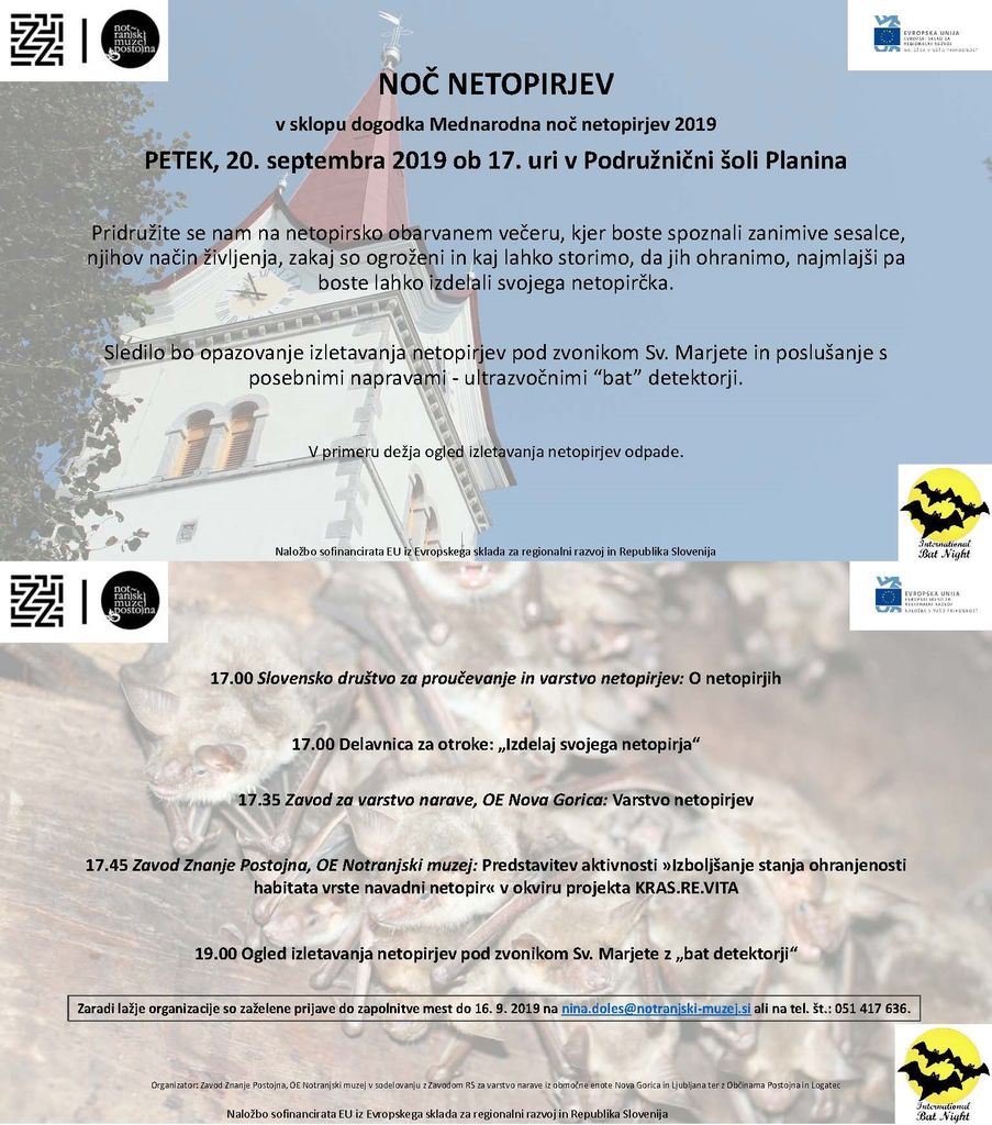 17.45 Zavod Znanje Postojna, OE Notranjski muzej: Predstavitev aktivnosti »Izboljšanje stanja ohranjenosti habitata vrste navadni netopir« v okviru projekta KRAS.RE.VITA