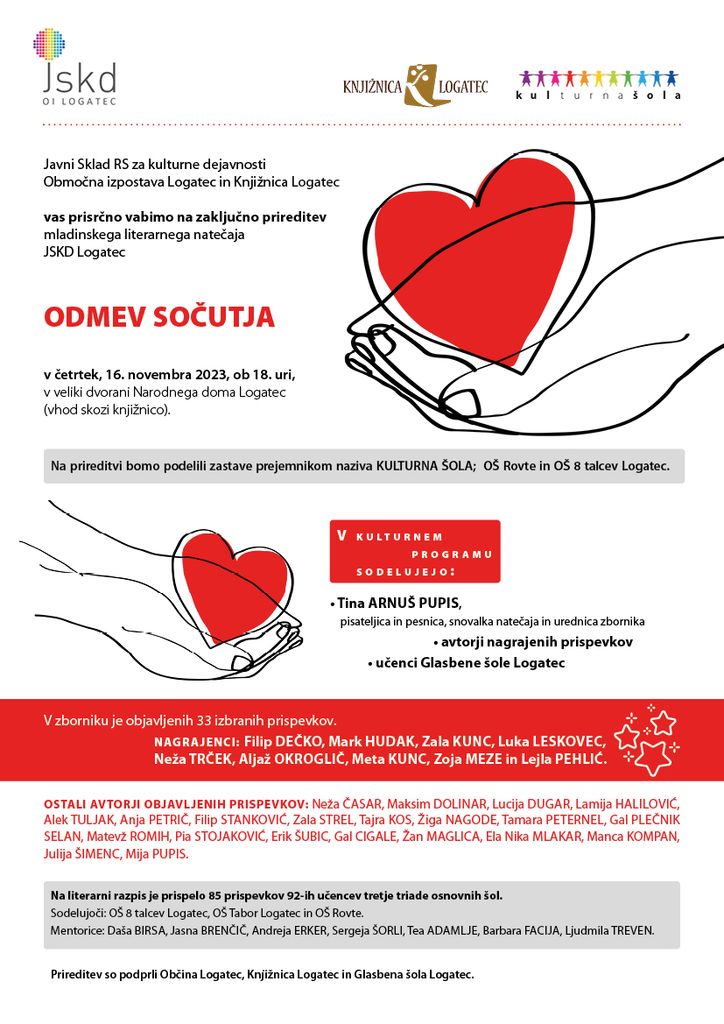 organizira zaključno prpireditev mladinskega literarnega natečaja JSKD Logatec ODMEV SOČUTJA.