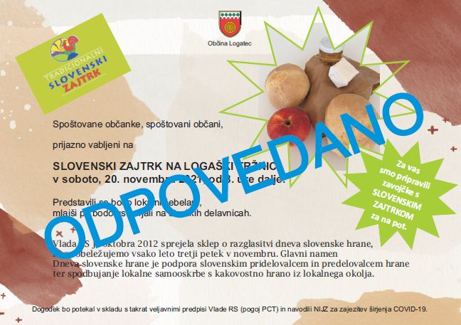 Dogodek - Slovenski zajtrk na tržnici v Logatcu, 20. november 2021, odpovedan zaradi ukrepov za zajezitev novega koronavirusa.