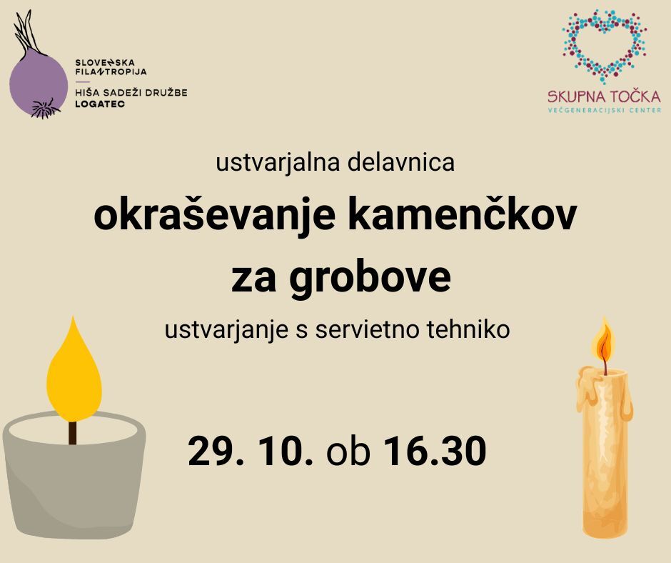 Ponovno bomo ustvarjali s servietno tehniko! Tokrat bomo namesto okraševanja školjk krasili kamenčke za na grobove. Vabimo vas, da letos namesto sveč za 1. november na grob odnesete svečko na kamenčku.