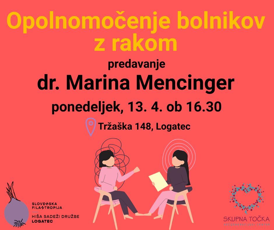 Vabimo na predavanje o vlogi, ki jo imamo bolniki pri poteku zdravljena, ko gre za diagnozo raka. Asist. dr. Marina Mencinger dr. med, specialist interne medicine bo govorila o odgovornosti, ki jo bolniki lahko prevzamejo za svoje zdravljenje in moči, ki bi jo bolniki morali imeti pri soodločanju o poteku zdravljenja. V predavanju bo pojasnila kaj pomeni beseda opolnomočenje in kakšne prednosti prinaša bolniku z rakom in družbi nasploh. Predstavila bo pomen ciljev zdravljenja in vlogo bolnika pri doseganju le-teh ter na razumljiv način predstavila določene pogosto uporabljene pojme kot so dopolnilno zdravljenje, tarčno zdravljenje, imuno-terapija.