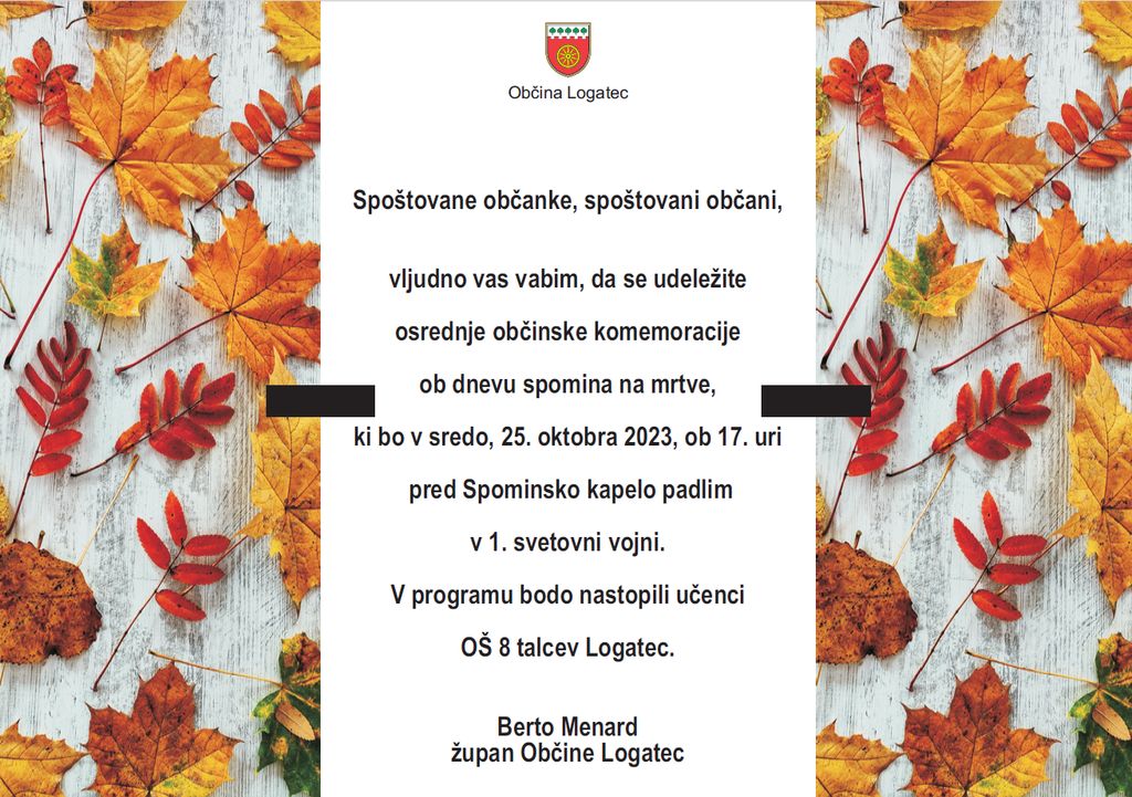 Vabimo vas na osrednjo občinsko komemoracijo, ki bo v sredo, 25. 10. 2023, ob 17. uri pred Spominsko kapelo padlim v 1. svetovni vojni. Program nam bodo tokrat pomagali oblikovati učenci OŠ 8 talcev Logatec.