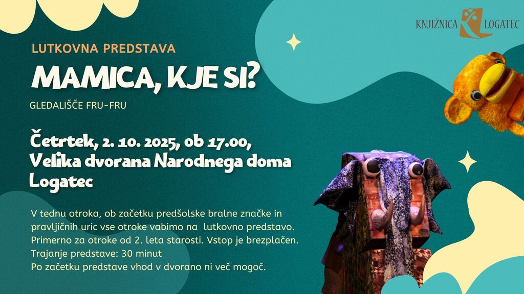 V tednu otroka, ob začetku predšolske bralne značke in pravljičnih uric vse otroke vabimo nalutkovno predstavo Mamica, kje si? gledališča FRU-FRU.