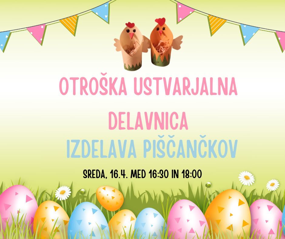 Srečamo se v sredo, 16.4. ob 16:30, ko bomo izdelovali prav posebne piščančke iz papirja. Posebni so zato, ker bodo služili tudi kot "košarice" za vaše pirhe.