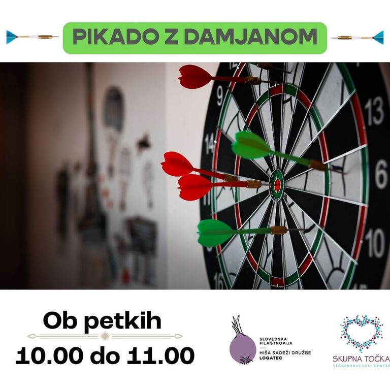 Radi mečete puščice proti centru? Ali pa vedno pristanejo kje drugje? V obeh primerih vas bomo veseli. Vsak petek ob 10h pri nas ciljamo tarčo. Včasih nam gre bolje, včasih slabše, ampak vedno smo dobre volje, kaj dobrega pozobamo, popijemo čaj, kavo, sok, se pogovorimo in odidemo domov boljše volje. :)