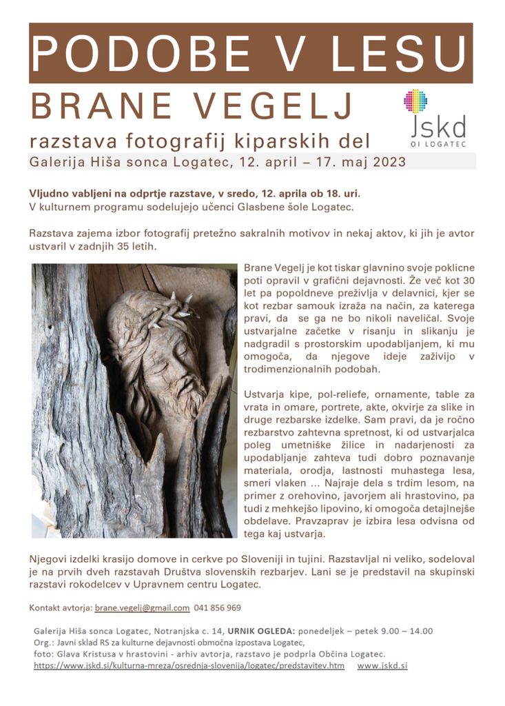 Javni sklad RS za kulturne dejavnosti območna izpostava Logatec vabi na odprtje in ogled razstave logaškega ljubiteljskega rezbarja iz Petkovca. Razstavljen bo izbor fotografij kiparskih in rezbarskih del, ki jih je avtor ustvaril v zadnjih 35 letih.