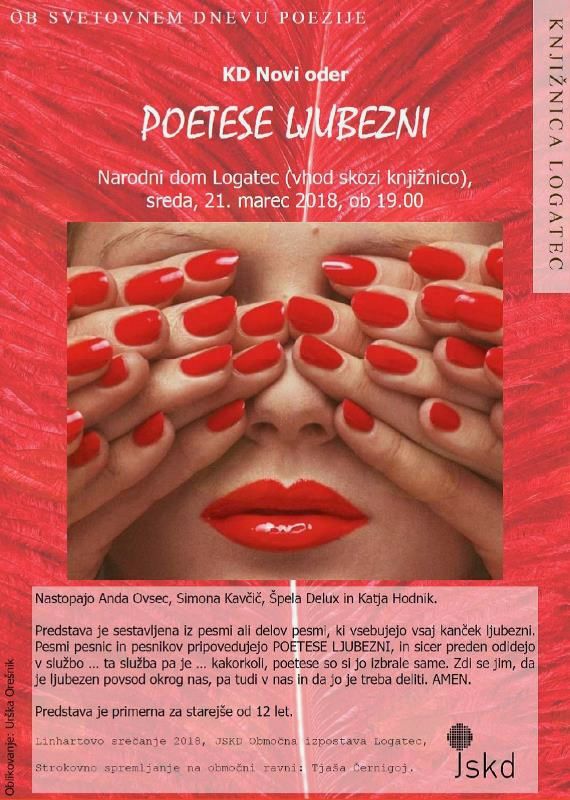 Ob svetovnem dnevu poezije KD Novi oder s Knjižnico Logatec in JSKD Logatec vabi na predstavo, POETESE LJUBEZNI,