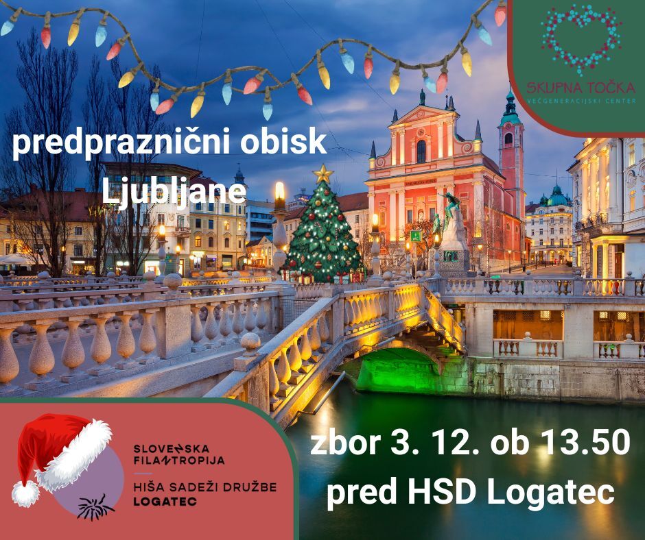 V sredo, 3. 12. se bomo z javnim prevozom odpravili na predpraznični ogled Ljubljane! Dobimo se ob 13.50 pred HSD Logatec. Obvezne so prijave. Za izpolnitev prijavnice nas kontaktirajte na e-mail hisa-logatec@filantropija.org oz. po telefonu na 070 892 903 - Maja. Lahko se tudi osebno oglasite v naši Hiši.