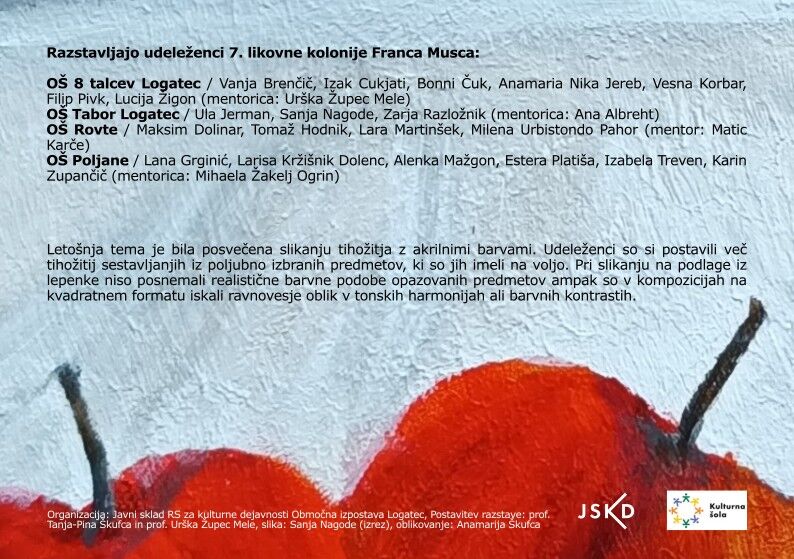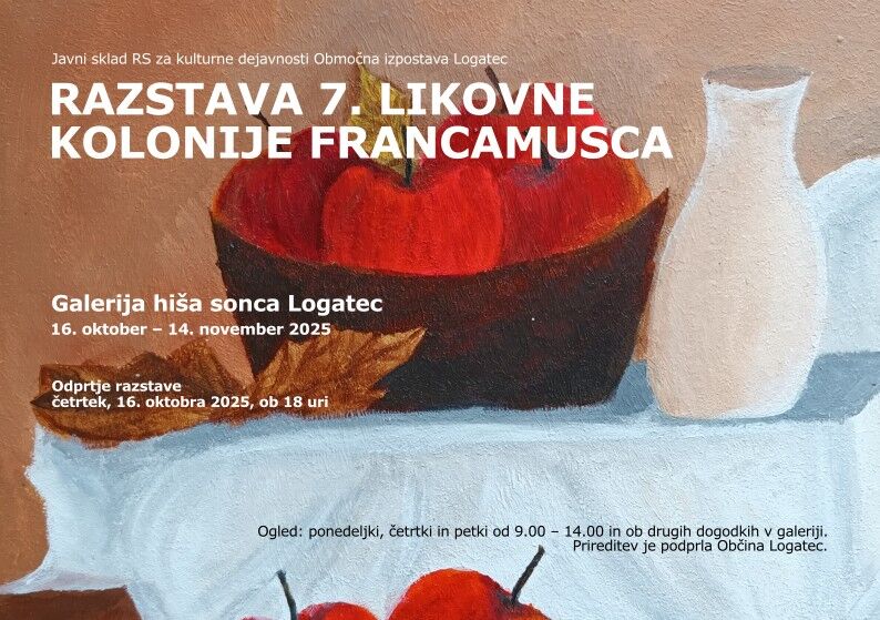 v četrtek, 16. oktobra, ob 18. uri, v Galeriji hiša sonca Logatec odpira razstavo slikarskih del udeležencev tradicionalne letos že 7. likovne kolonije Franca Musca. Kolonija, ki nosi ime po izjemnem in plodnem logaškem slikarju – samouku Francu Muscu (1948 – 2017), je namenjena likovno nadarjenim učencem tretje triade OŠ in njihovim mentorjem. Predstavljena bodo dela dvajsetih mladih likovnikov, ki so 9. septembra ustvarjali na domačiji "Pr Šinkovc" na Medvedjem Brdu.