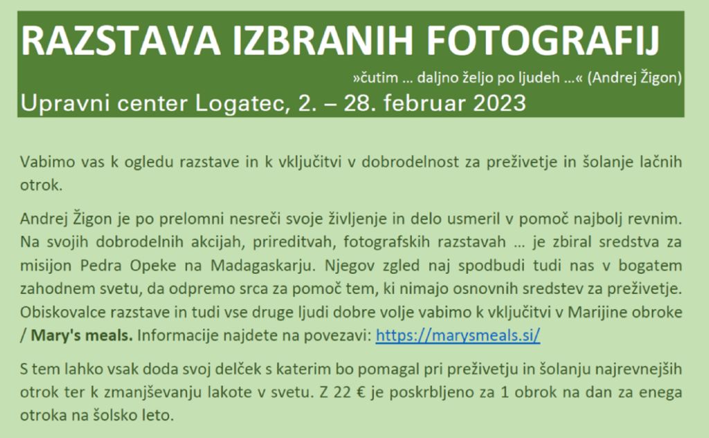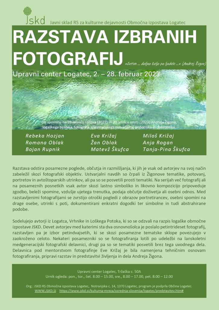 Fotografska razstava je posvečena spominu 70-letnice rojstva (2022) in 20-letnice smrti (2023) Andreja Žigona, logaškega poeta, fotografa, vsestranskega ustvarjalca, popotnika in dobrotnika.