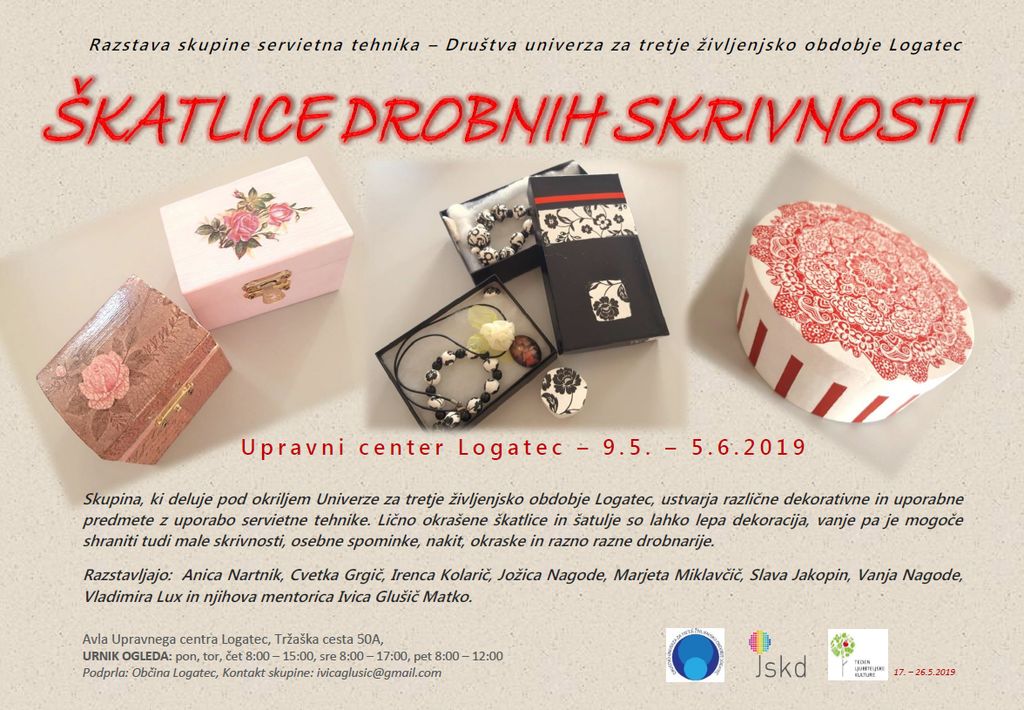 Društvo UTŽO in JSKD Logatec vabita k ogledu dekorativnih izdelkov v avli logaškega Upravnega centra. Skupina ki pod vodstvom mentorice Ivice Glušič Matko ustvarja uporabne in dekorativne predmete z uporabo servietne tehnike, je pripravila nabor lično okrašenih škatlic. Razstava spada v sklop prireditev v Tednu ljubiteljske kulture - TLK (17. - 26. 5. 2019), na ogled pa bo že od 9. maja in vse do 5. junija.
