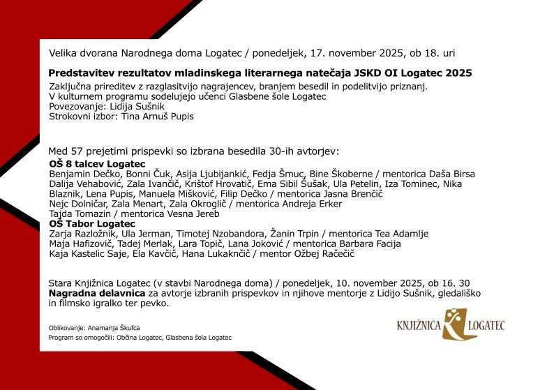 vabita na zaključno prirediev mladinskega literarnega natečaja JSKD Logatec 2025.