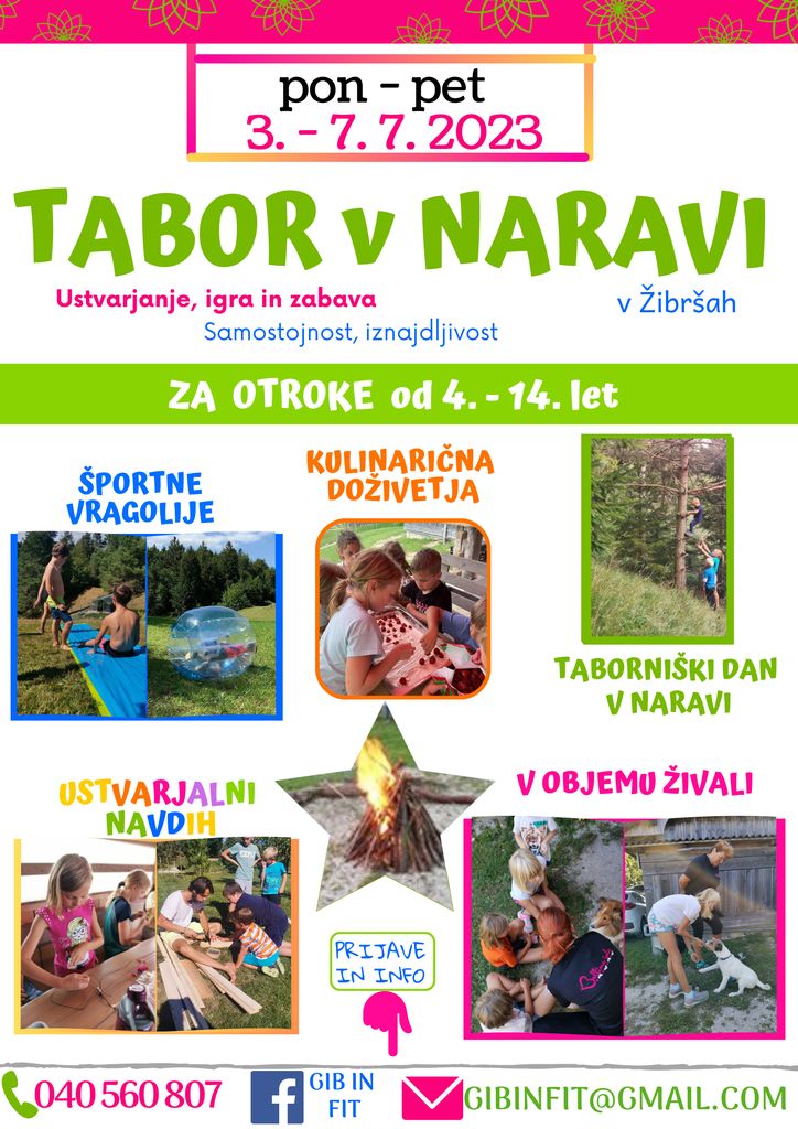 Za otroke smo pripravili pester taborniški program. Več o taboru si lahko preberete na http://gibinfit.si/sl/tabor2023