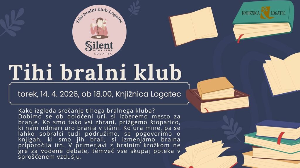 Tihi bralni klub Knjižnice Logatec (Silent book club): V glasnem svetu, ki se vrti v naglici, trenutek za tiho branje predstavlja oazo miru in sprostitve. V ta namen smo ustanovili tihi bralni klub, na katerem ni nobenih predpisanih branj in kakršnih koli obvez – pride lahko kdor koli, na katero koli srečanje. S tem vam ponujamo rešitev, da si – brez izgovorov – vzamete dobro uro časa zase in za branje.
