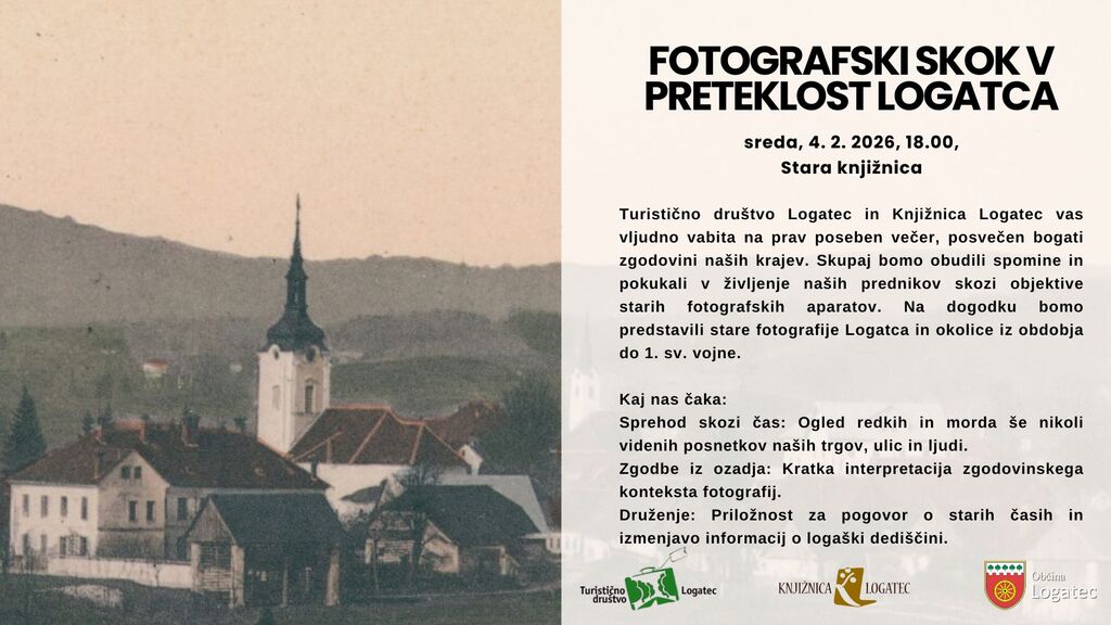 Turistično društvo Logatec in Knjižnica Logatec vas vljudno vabita na prav poseben večer, posvečen bogati zgodovini naših krajev. Skupaj bomo obudili spomine in pokukali v življenje naših prednikov skozi objektiv starih fotografskih aparatov.