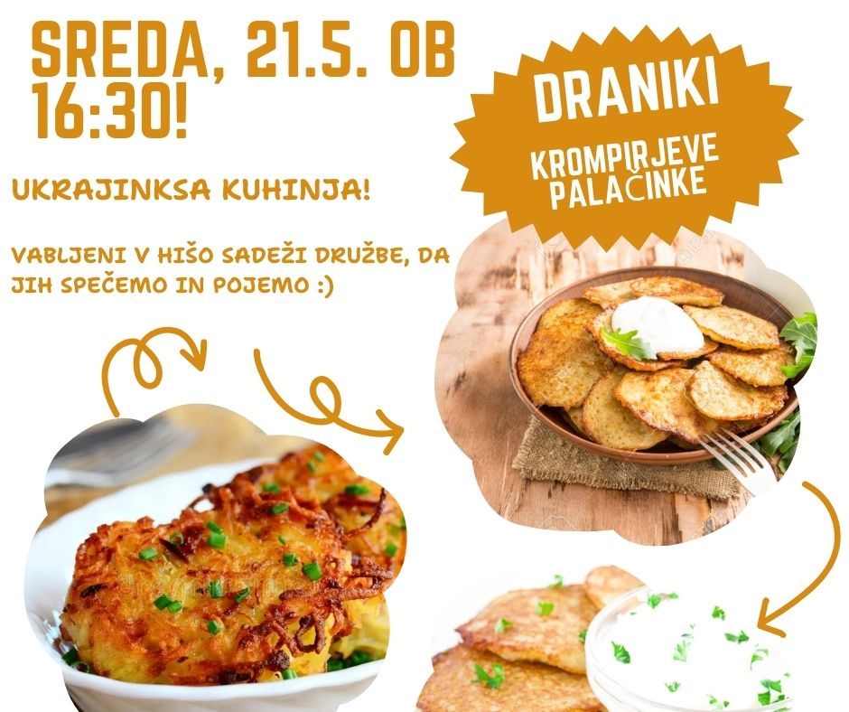 Z nami bo naša ukrajinska prostovoljka Dalila, ki bo v slovenščini predstavila njihovo tradicionalno jed - dranike. Skupaj jih bomo nato pripravili, pojedli in se kaj novega naučili o sebi in drugih.