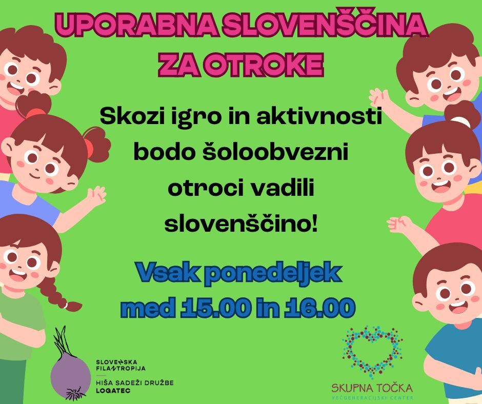 Z oktobrom v Hiši začenjamo z uporabno slovenščino za otroke. Vabljeni vsi otroci, ki si želite izboljšati svoje znanje slovenskega jezika. Slovenščino se bomo učili skozi razne igre in aktivnosti, po potrebi pa naredili tudi domačo nalogo.