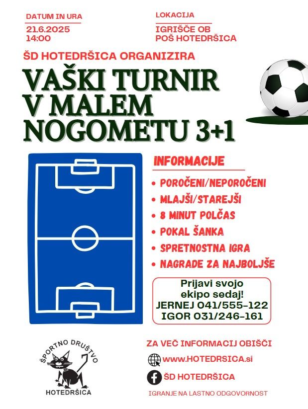 Vaški turnir v malem nogometu se bo odvijal v soboto 21.6.2025 na športnem igrišču pred osnovno šolo v Hotedršici. (Hotedršica 120, 1372 Hotedršica)