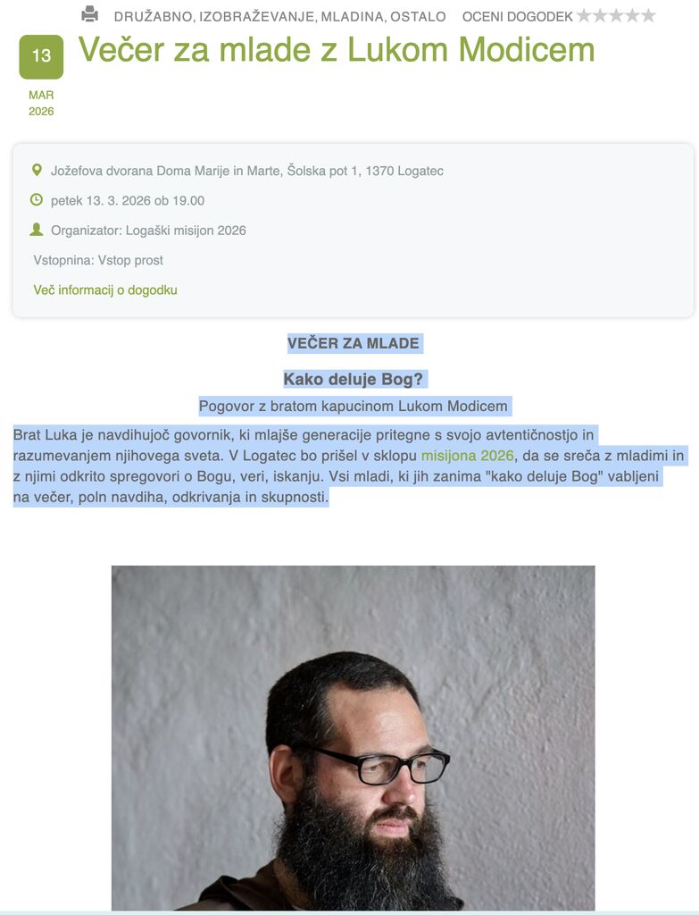 Brat Luka je navdihujoč govornik, ki mlajše generacije pritegne s svojo avtentičnostjo in razumevanjem njihovega sveta. V Logatec bo prišel v sklopu misijona 2026, da se sreča z mladimi in z njimi odkrito spregovori o Bogu, veri, iskanju. Vsi mladi, ki jih zanima "kako deluje Bog", vabljeni na večer poln navdiha, odkrivanja in skupnosti.