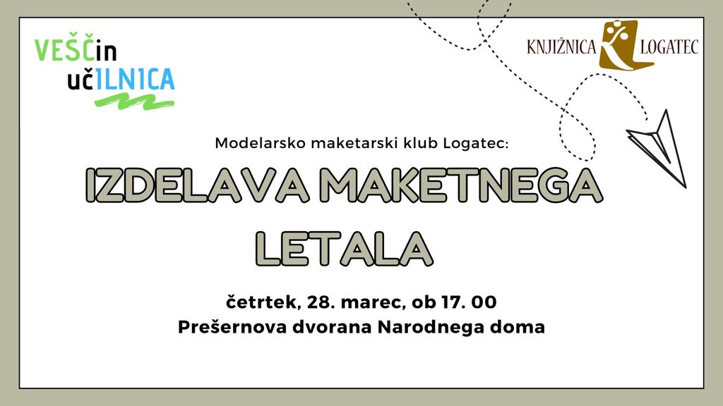 Na tokratni Veščilnici se bo predštavil Modelarsko maketarski klub Logatec. Udeleženci bodo spoznali osnove modelarstva in sestavili malo letalo imenovano drsalec. Delavnica je primerna za vse starejše od 8 let. Število mest je omejeno, zato so potrebne prijave na: prireditve@knjiznicalogatec.si