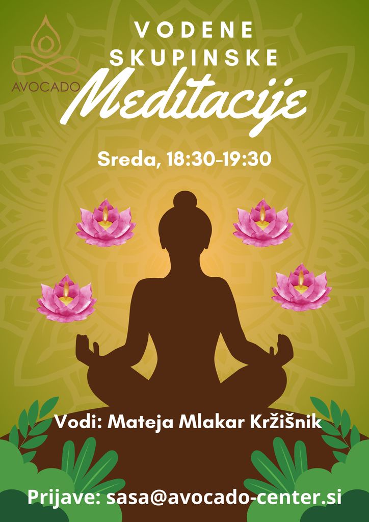 Vodenim skupinskim meditacijam se lahko pridružite, če ste ravno stopili na pot raziskovanja sebe skozi meditacijo ali pa meditacijo že poznate in jo prakticirate. Skupinska meditacija ima zelo veliko moč in meditiranje v skupini daje popolnoma nov pogled na svet in dogajanje v nas in okrog nas.