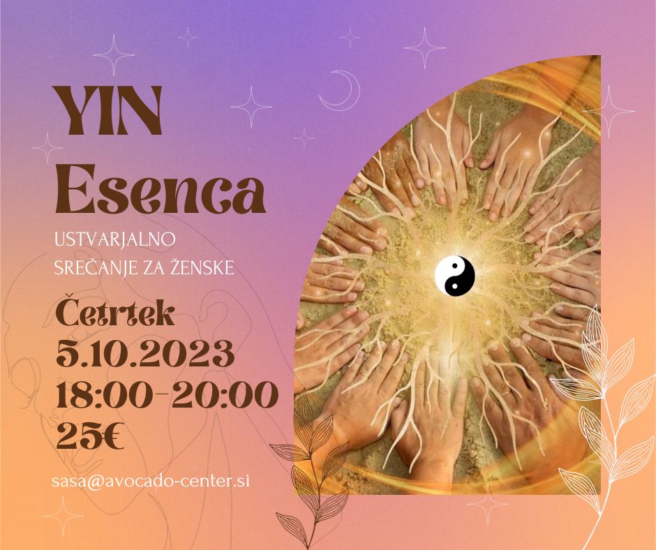 tvoje bitje je celostno. Vedno je bilo, vedno je in vedno bo. Yin esenca, ženska esenca, je tvoje notranje bistvo, to kar dela tebe, z vsemi vzponi in padci v tvojem življenju. Yin je celota - je tvoj dom. Prostor, kjer si slišana, razumljena in ljubljena. Prostor, da izraziš sebe. Naučila se boš, kako biti stiku s svojim življenjem, s svojimi občutki in potrebami, krepila boš svoj notranji ogenj, svojo edinstveno lepoto, senzualnost ali drugih osebnih interpretacij ženskosti, ter se povezovala z skupnostjo žensk, ki si tudi tega srčno želijo.