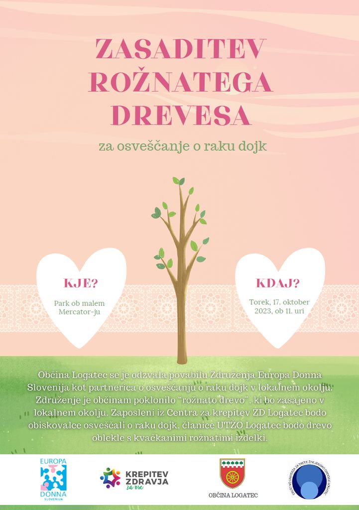 Zaposleni iz Centra za krepitev zdravja ZD Logatec bodo obiskovalce osveščali o raku dojk, zdravem načinu življenja in pomenu zgodnjega odkrivanja bolezni, članice Univerze za tretje življenjsko obdobje Logatec – sekcija kvačkanje pa bodo drevo oblekle v kvačkane rožnate izdelke.