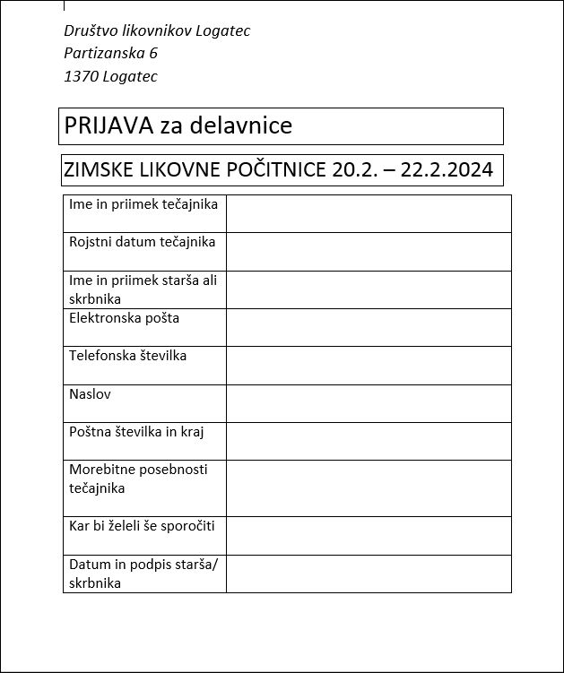 Delavnice so odlična priložnost za ustvarjalno preživljanje zimskih počitnic, pomoč za trening vsem, ki nameravajo opravljati preizkus likovne nadarjenosti za vpis v srednjo šolo.
