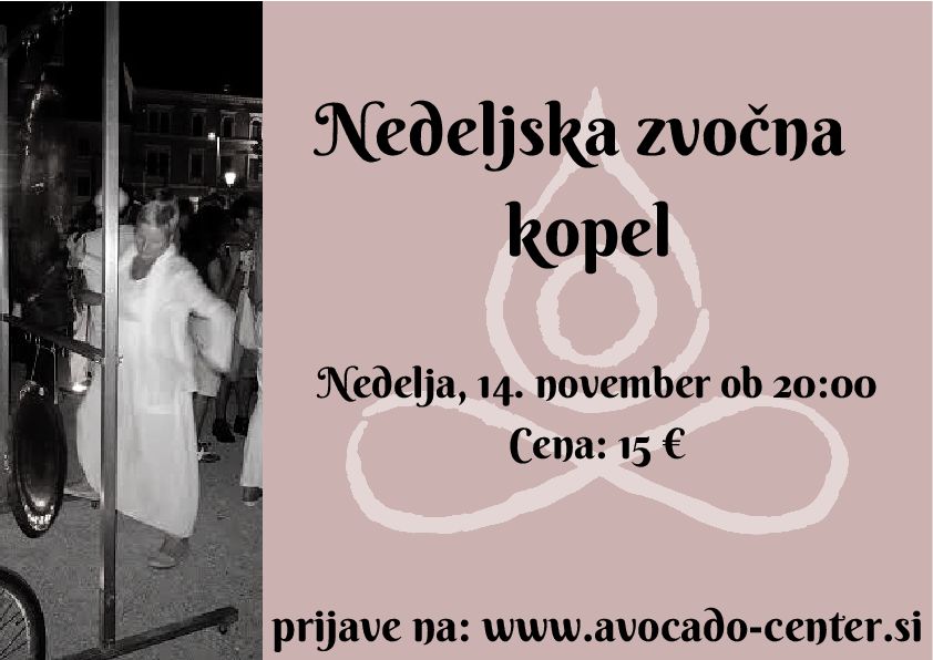 Zvočna kopel je skupinsko sproščanje ob vibracijah holističnega zvoka gonga, tibetanskih pojočih posod in kristalnih posod, ki nas povežejo z višjimi aspekti življenja. Intuitivno se vključijo tudi ostala glasbila – šamanski boben, ropotuljice, zvončki, dežne palice, itd., ki nas povežejo s štirimi elementi - zemljo, vodo, zrakom in ognjem. Močne vibracije zvoka pomagajo sprostiti stres, ki se je nabral preko tedna, zrahljajo blokade in podpirajo samozdravljenje našega fizičnega, čustvenega in energetskega telesa.