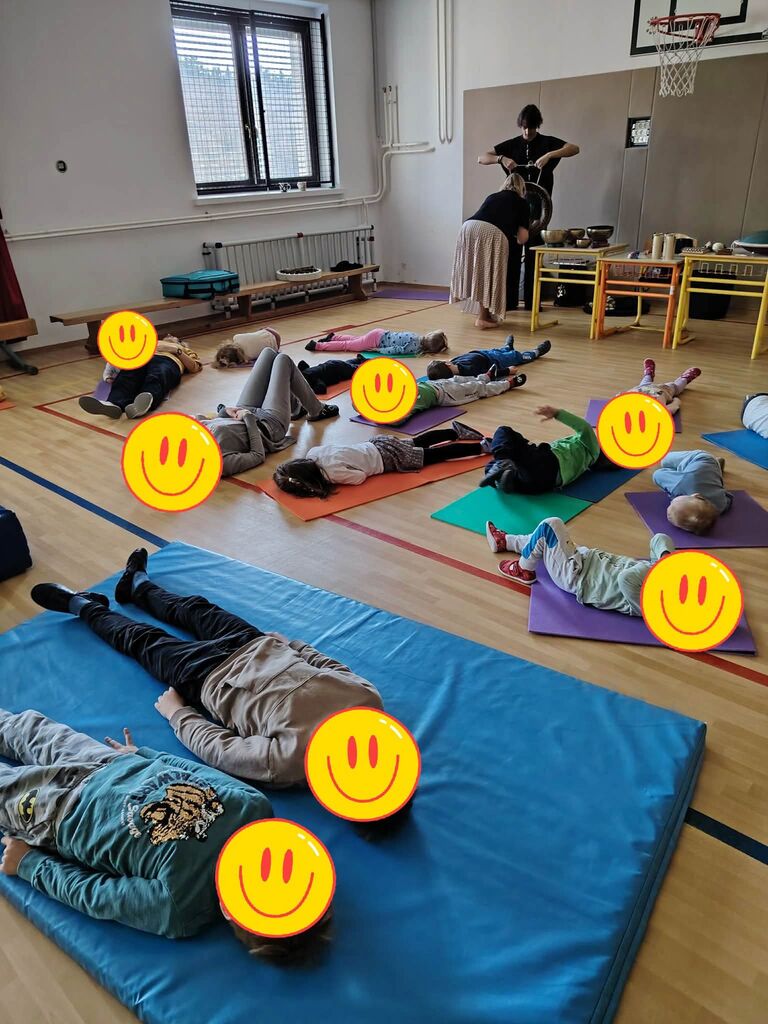Začnemo s prikazom delovanja zvoka na telo in nadaljujemo z nežnim sproščanjem ob zvočni kopeli in vodenemu delu. Otroci bodo sedeli ali ležali ter se prepustili umirjanju pri poslušanju in zaznavanju. Priporočljivo je, da zmorejo približno pol ure mirovati.