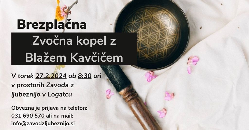 "V torek 27.2.2024 ob 8:30 uri bo v našem zavodu potekala brezplačna zvočna kopel, ki jo izvaja Blaž Kavčič. Udeleženci po terapiji občutijo globok mir in sproščenost.