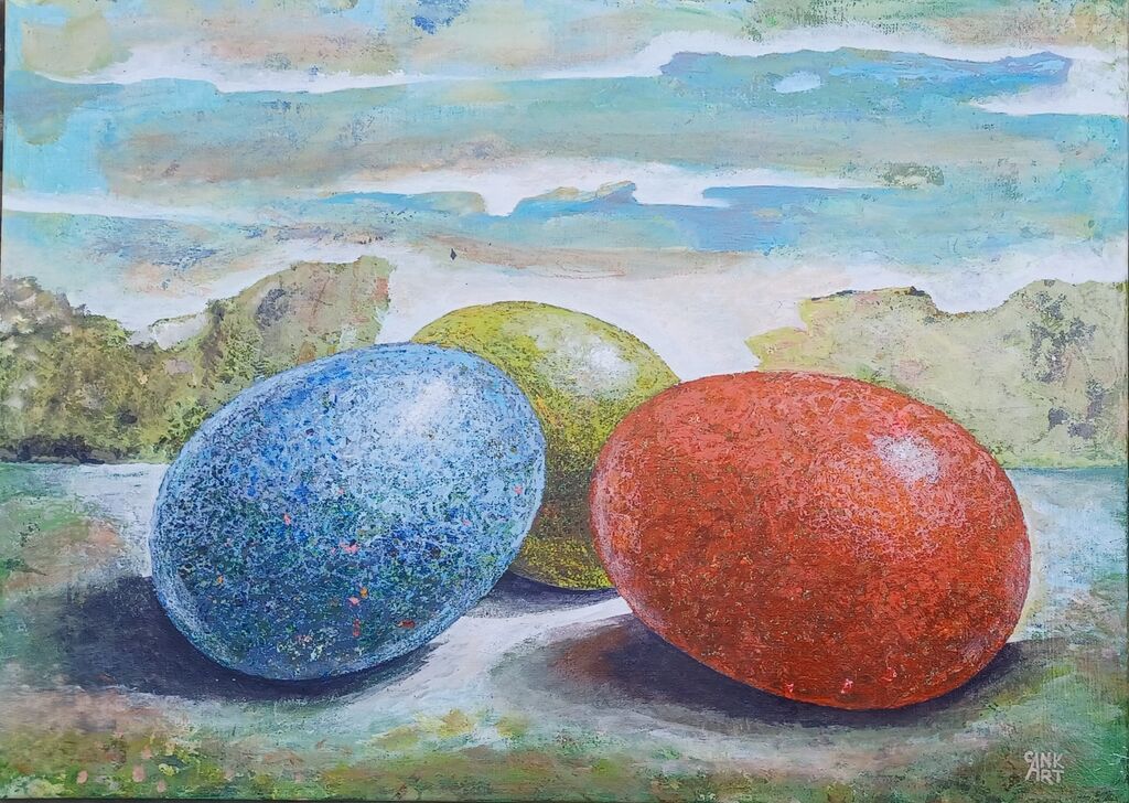 Slika spada v avtorjev t. i. Vesoljski program, v katerem se posveča krogu kot obliki vseh oblik. Izpelje jo v jajčasti variaciji in ji vdahne nove, simbolne pomene. Še dodatno jo izkoristi za koncentrat likovnega življenja, ki je tudi vir vsebinskega. Znotraj izbrane forme se ritmično ubrano pretakajo in sintetizirajo barvni nanosi ter v navidezni lahkotnosti dosežejo volumetrično (po)polnost. Ozadje ni vsebinsko jasno določeno, a skozi slikarsko premišljene rešitve; skozi barve, strukture in ploskve, postane z naravnim okoljem povezan prostor.