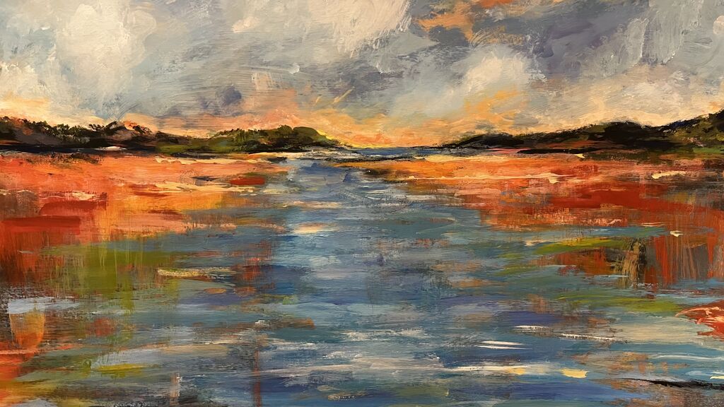 Slika sega v sfere abstraktnega, a asociacije na vodno gladino in nebo, jo vodijo v krajinsko motiviko, odprto v globino, proti horizontu. Bolj kot ambientalne danosti, avtorico zanimajo temporalne. Ustvari jih z živahnimi barvami, s kontrastnimi odnosi, z odločnimi, sproščenimi in ekspresivno izživetimi potegi. Plastenja in barvni impasti prispevajo k dodatnemu barvnemu razkošju in površinski razgibanosti.