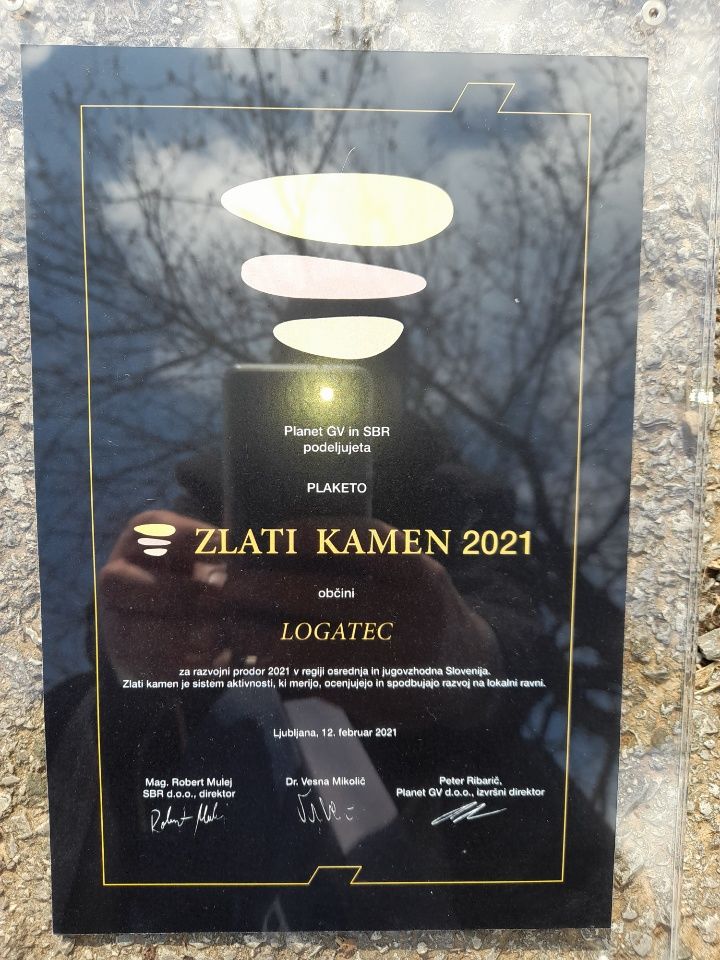 Občini Logatec je bila v finalnem izboru podeljena Plaketa Zlati kamen 2021, in sicer za razvojni prodor 2021 v regiji osrednja in jugovzhodna Slovenija.