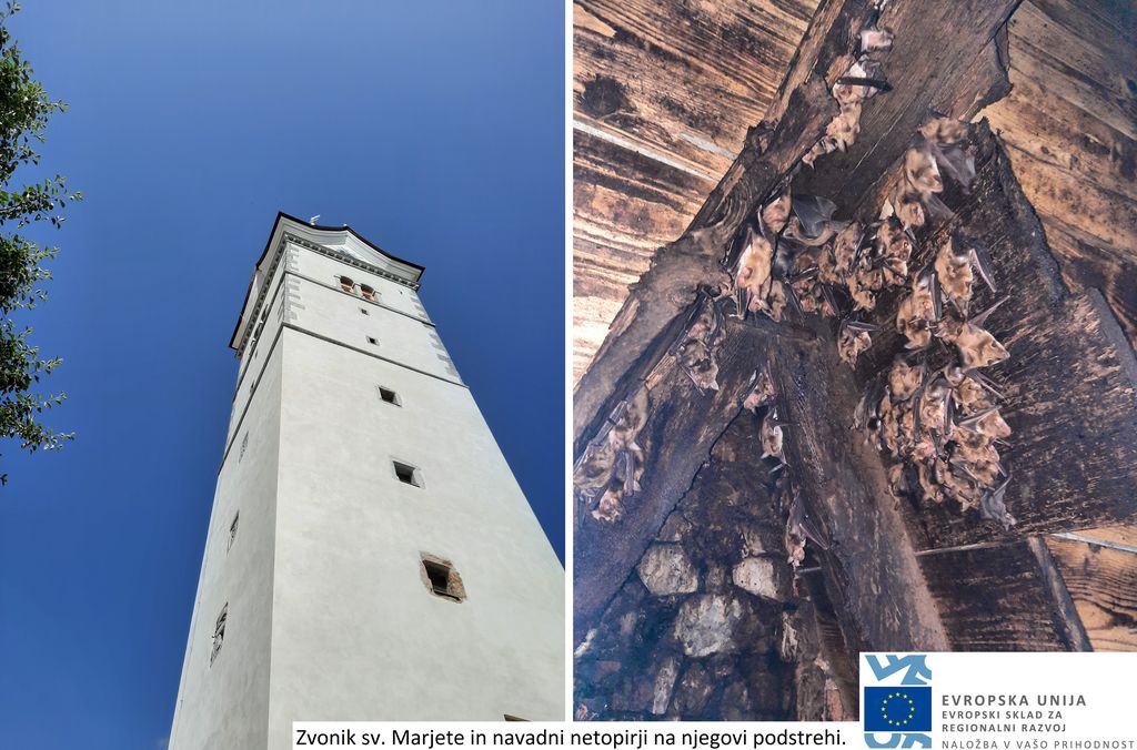 V cerkvi sv. Marjete se nam je pridružil tudi predstavnik Zavoda za varstvo kulturne dediščine Slovenije. Skupaj smo obiskali podstrešje zvonika, si ogledali v sklopu projekta izvedena dela ter seveda tudi kolonijo netopirjev. Letos smo na podstrehi zvonika zasledili 570 odraslih navadnih netopirjev, 41 mladičev ter tudi enega samca druge vrste – dolgonogega netopirja.