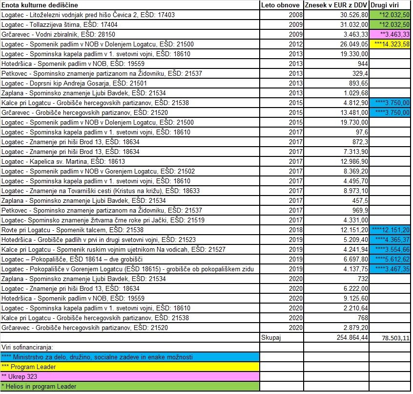 Na območju občine Logatec je 215 kot kulturna dediščina registriranih enot. Gre za 4 grobišča, 45 območij, 49 spomenikov in obeležij ter 117 stavb. Občina Logatec je lastnica 22 enot kulturne dediščine. V obdobju od 2008 do 2020 je skladno z zakonoma, ki urejata področji kulturne dediščine in vojnih grobišč, obnovila večino svojih enot in vojnih grobišč ter grobov na območju občine. Za ta namen je bilo v 12. letih porabljenih 208.905,30 EUR brez DDV, na podlagi uspešnih prijav na sofinanciranja z državnimi, evropskimi in zasebnimi sredstvi pa je dobila povrnjenih 78.503,11 EUR, kar predstavlja 38 % upravičenih sredstev (DDV se ne vrača).